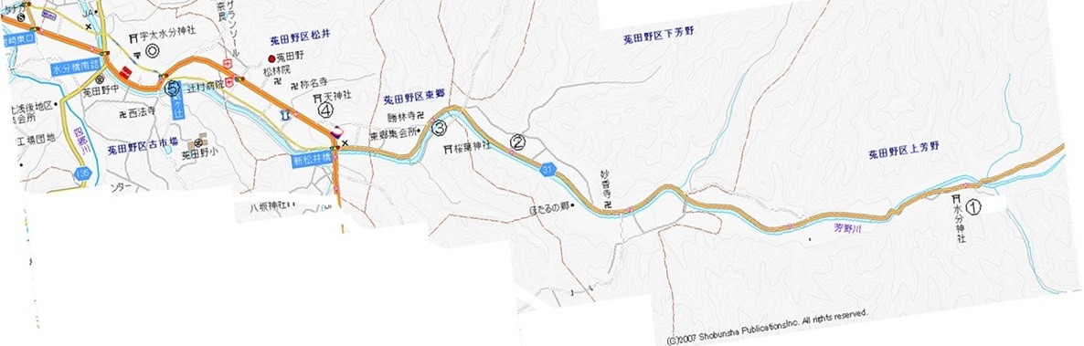 上芳野(芳野川の上流)に位置する惣社水分神社の女神様である速秋津姫命(はやあきつひめのみこと)様が、夫君である宇太水分神社(地図◎)の男神様、速秋津彦命(はやあきつひこのみこと)様に年に一度だけ、お会いになるため、六キロの道のりをお神輿にて渡御されるというロマンチックなお祭です。